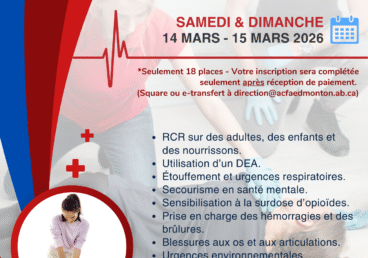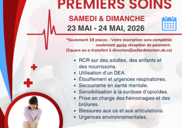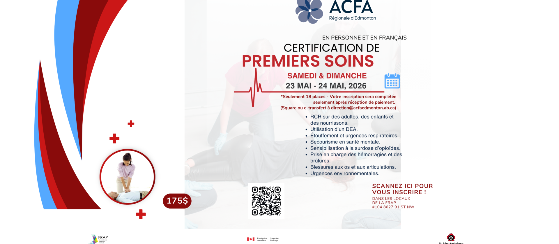 14 Mar 2026 au 15 Mar 2026 Dans les locaux de la frap, #104 8627 91 St nwCours de premiers soins en français En collaboration avec Ambulance St-Jean, l'ACFA.