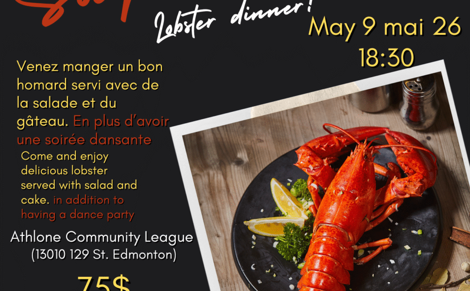 L’ACFA régionale d’Edmonton vous invite à une soirée gourmande et festive! Rejoignez nous pour un succulent repas de homard, agrémenté d’une salade et d’un gâteau, puis laissez-vous emporter par la musique et la danse jusqu’au bout de la nuit.