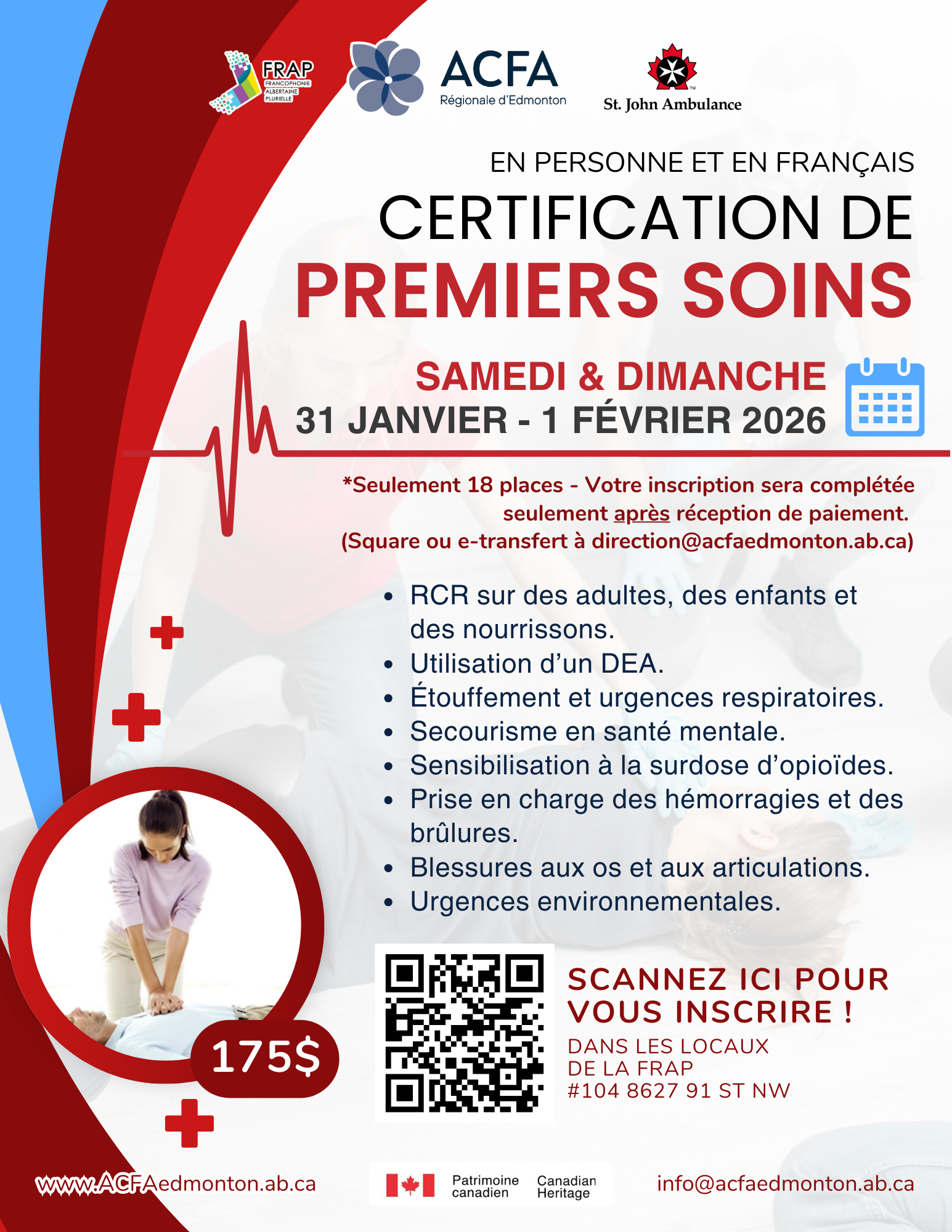 Le prochain cours de premiers soins aura lieu les 31 janvier et 1er février 2026.